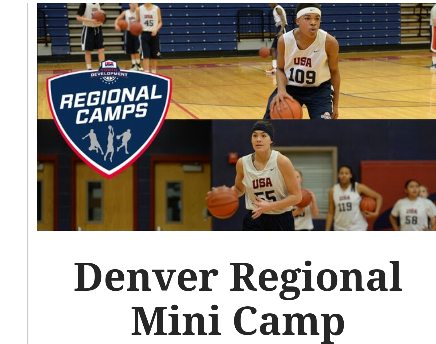 « All Events This event has passed. USA BASKETBALL REGIONAL MINI CAMP March 18, 2017 @ 8:00 am - 5:00 pm Event Navigation « Shoot 4 Success with Gerry Mosley, New York AAU SPRING FLING TOURNAMENT » USA BASKETBALL REGIONAL CAMP IN DENVER! MARCH 18, 2017 AGES 7-18 www.usabasketball.com + Google Calendar+ iCal Export Details Date: March 18, 2017 Time: 8:00 am - 5:00 pm Event Category: Camps Website: http://www.usabasketball.com Organizer USA BASKETBALL Email: youth@usabasketball.com Venue USA BASKETBALL DENVER, CO United States + Google Map